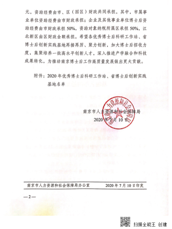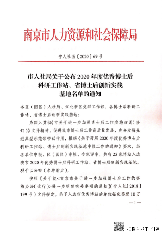 近日,南京市人社局公布了2020年優(yōu)秀博士后科研工作站、省博士后創(chuàng)新實踐基地名單,南大環(huán)保博士后科研工作站成功入選。